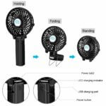 - Ventilador de mano y escritorio: puede ser ventilador de escritorio o ventilador de mano para satisfacer tus diferentes necesidades con un diseño fresco, puedes poner el ventilador en posición vertical o diagonal sobre la mesa, también es ideal para la oficina. Puedes llevarlo contigo fácilmente cuando sales a un picnic, compras, viajes, camping, etc.
