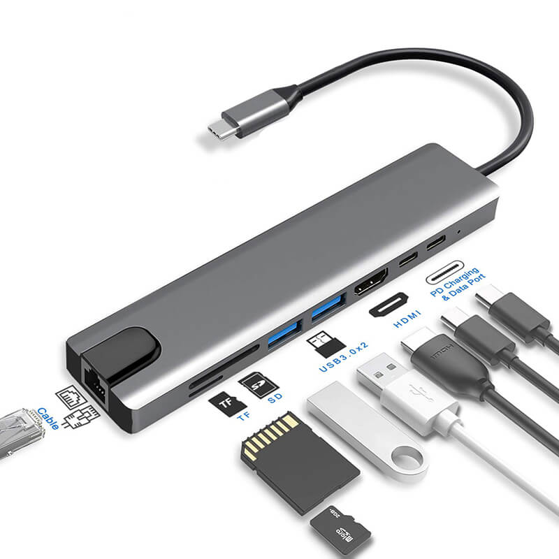 - 【HUB USB C 8 EN 1】: El adaptador de concentrador USB-C es compatible con todos los dispositivos que incluyen puertos Type-C/USB, especialmente para MacBook Pro y Air. HUB USB-C 8 en 1 incluye puerto USB 3.0, puerto USB 2.0, puerto USB C, puerto PD, salida de video HDMI 4K, interfaz Ethernet RJ45 100M y ranuras para lector de tarjetas SD/Micro SD, compatible con MacBook Pro/Air, Chromebook y más dispositivos tipo C. Para que puedas resolver el problema de una única interfaz de portátil en cualquier momento y lugar.