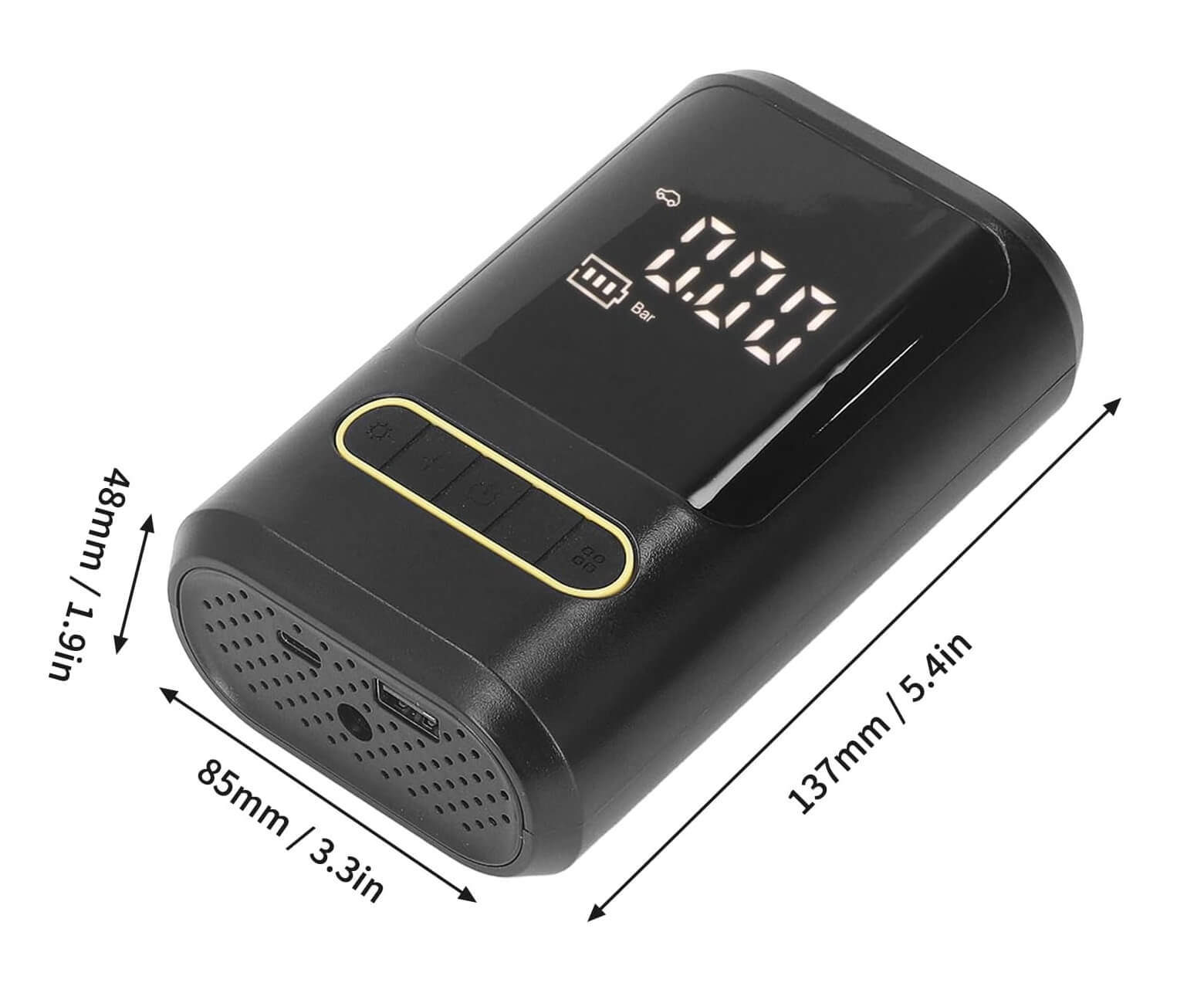 Inflador De Neumáticos La bomba está equipada con un sistema inteligente de preajuste y monitoreo que permite establecer la presión deseada de los neumáticos de forma precisa. Una vez alcanzada, el dispositivo se apaga automáticamente, garantizando seguridad y confiabilidad. Además, cuenta con una función versátil como fuente de alimentación móvil, ideal para cargar dispositivos electrónicos en exteriores, gracias a su práctico cable USB tipo C.