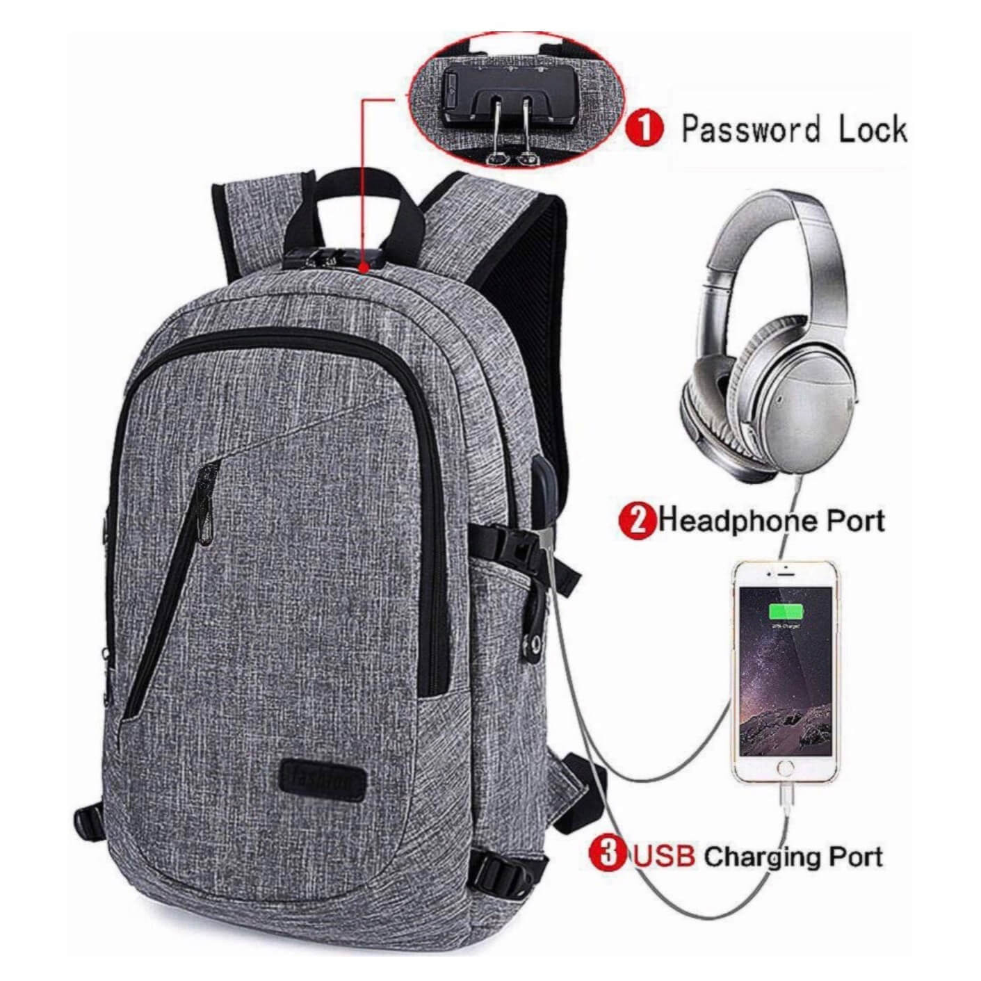 - Puerto USB y auriculares: puerto de carga USB externo con un cable de carga incorporado, esta mochila USB le ofrece una manera más conveniente de cargar su teléfono mientras camina. Y un puerto para auriculares externo para garantizar que esté siempre conectado a la música durante un viaje de negocios o de placer sin abrir la mochila. Tenga en cuenta: esta mochila no incluye energía en sí.